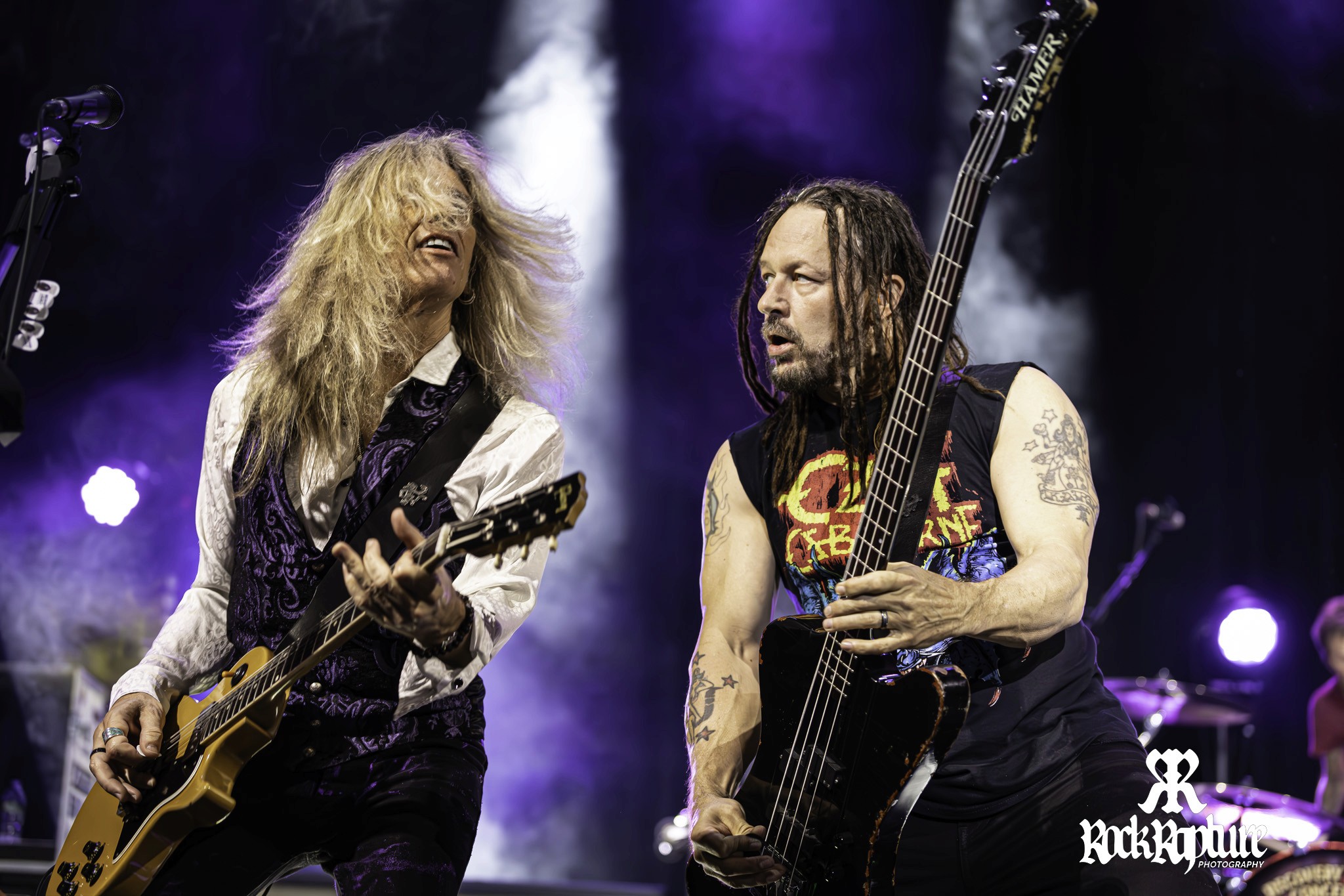 Brad’s ability to mimic almost any vocalist while maintaining his unique tone was on full display, and his bass playing was precise and powerful. His partnership with Shannon was flawless, with the two of them locked in and sharing a deep musical connection, even after three decades of not playing together. Shannon’s energy behind the drum kit was contagious, and he seemed to be feeding off the crowd’s excitement, his sticks becoming an extension of himself as he drove the band forward.